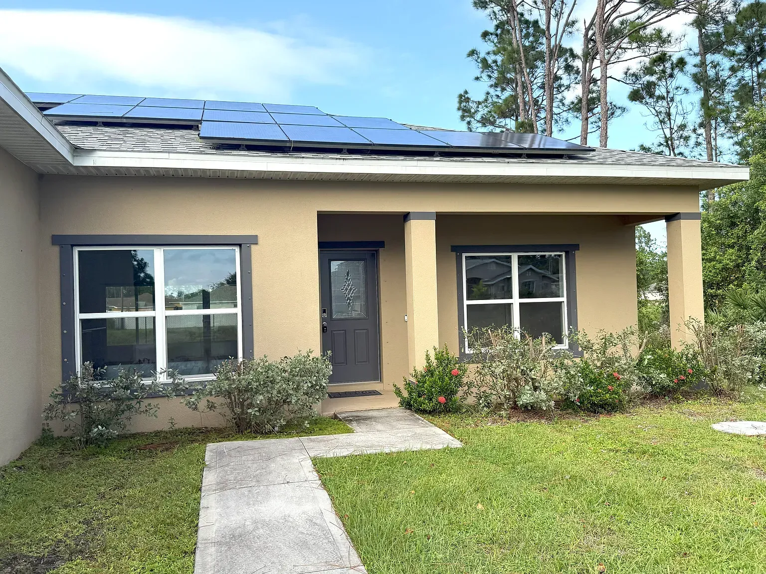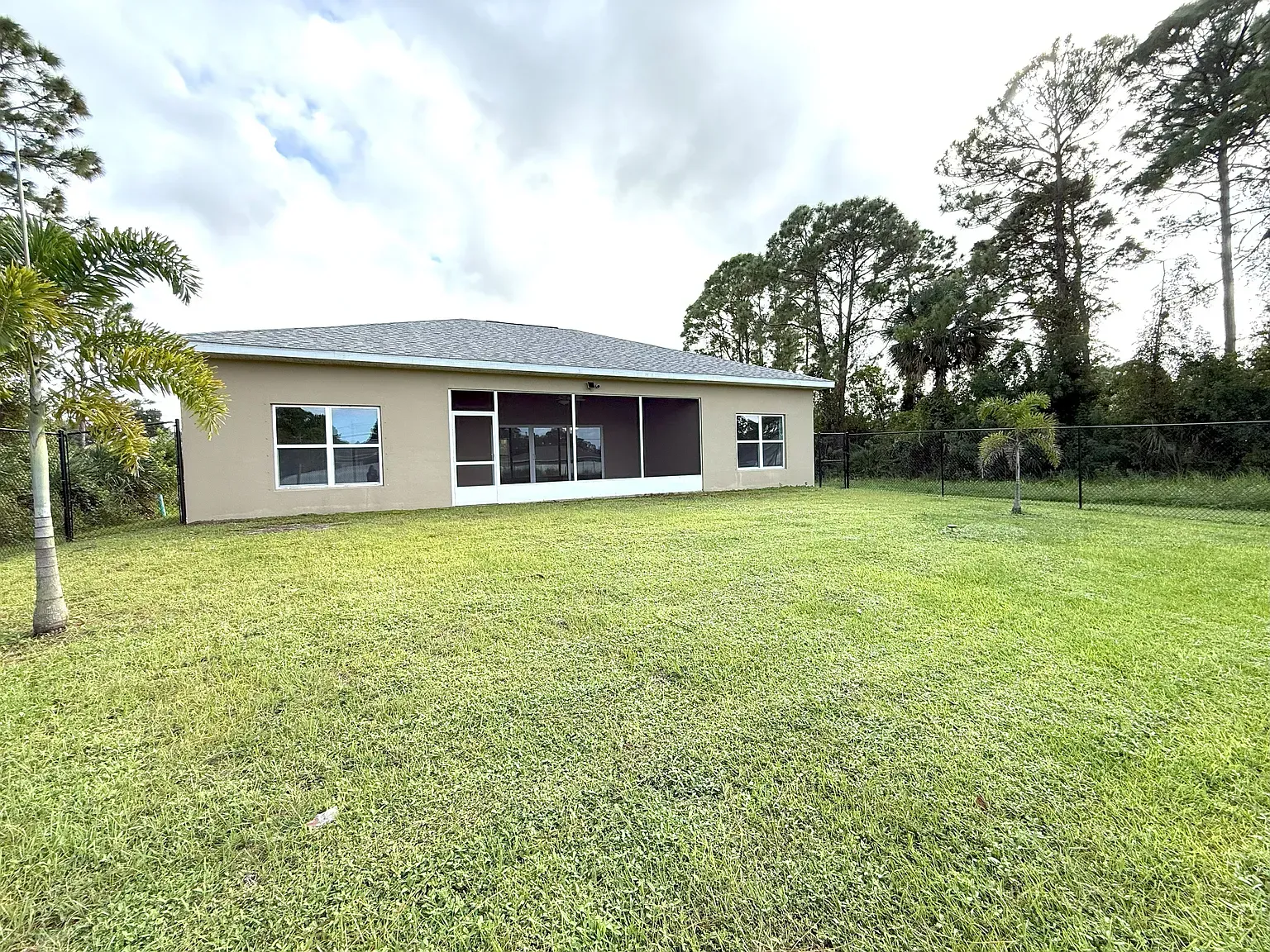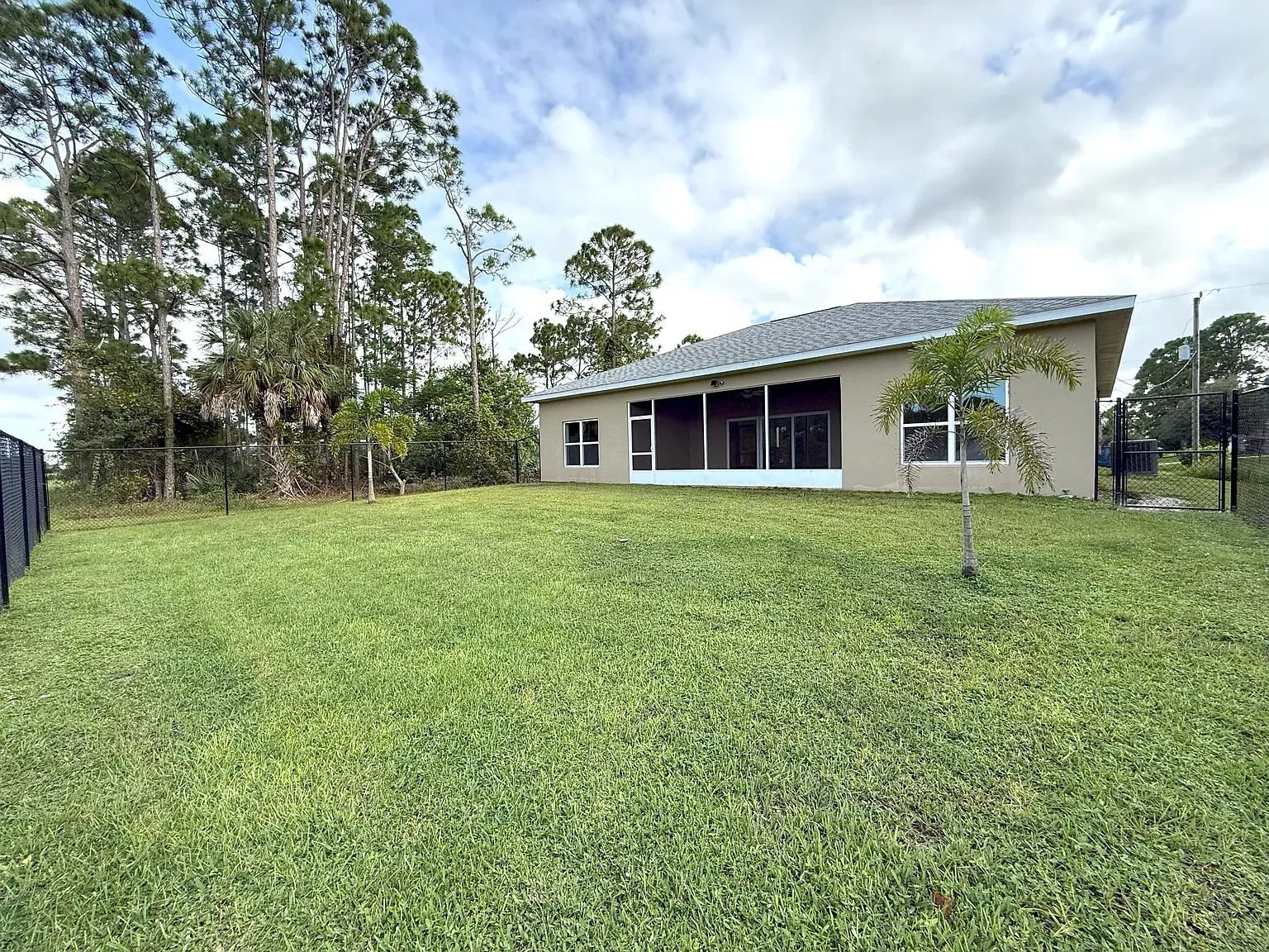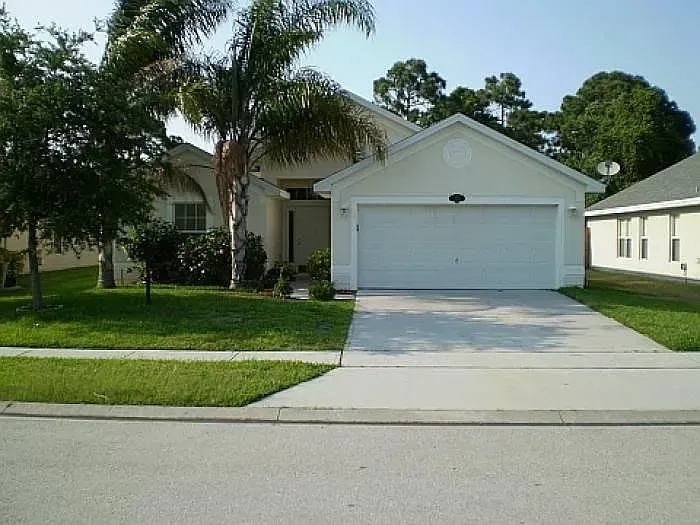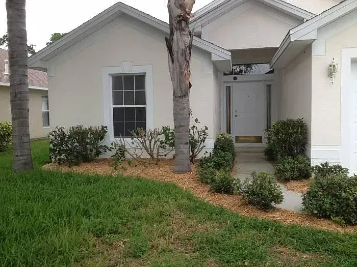 Stunning Nearly New 3BR/2BA, 2 Car Garage with city water. This home offers a blend of modern comfort and serene living. Step inside to discover an open split floor plan, accentuated by lots of natural light and high vaulted ceilings. Tiled floors in all main areas and Vinyl in bedrooms. No carpet. The kitchen features white cabinets, granite countertops, newer S.S. appliances, glass backsplash, and ample storage space. Oversized island with sleek lighting, breakfast bar, and pantry. The primary bedroom offers a peaceful retreat with large window & a walk-in closet. En-suite bathroom offers a glass-enclosed walk- in shower, dual vanities & granite tops. Two Secondary bedrooms are generously sized, with full guest bath featuring tiled shower/tub combos. Inside laundry room with washer and dryer. Two car garage. Enjoy outdoor living in a fenced in backyard oasis, overlooking the canal and Florida wild life. Screened trussed porch ideal for entertaining or unwinding after a long day. House is powered w/Solar Panels providing low cost electric bills. Convenient location, near schools, great shopping, restaurants and the beach. Easy access to major roadways only add to the charm of this home. Rent includes lawn care. Owner will consider Small pets. Available now.