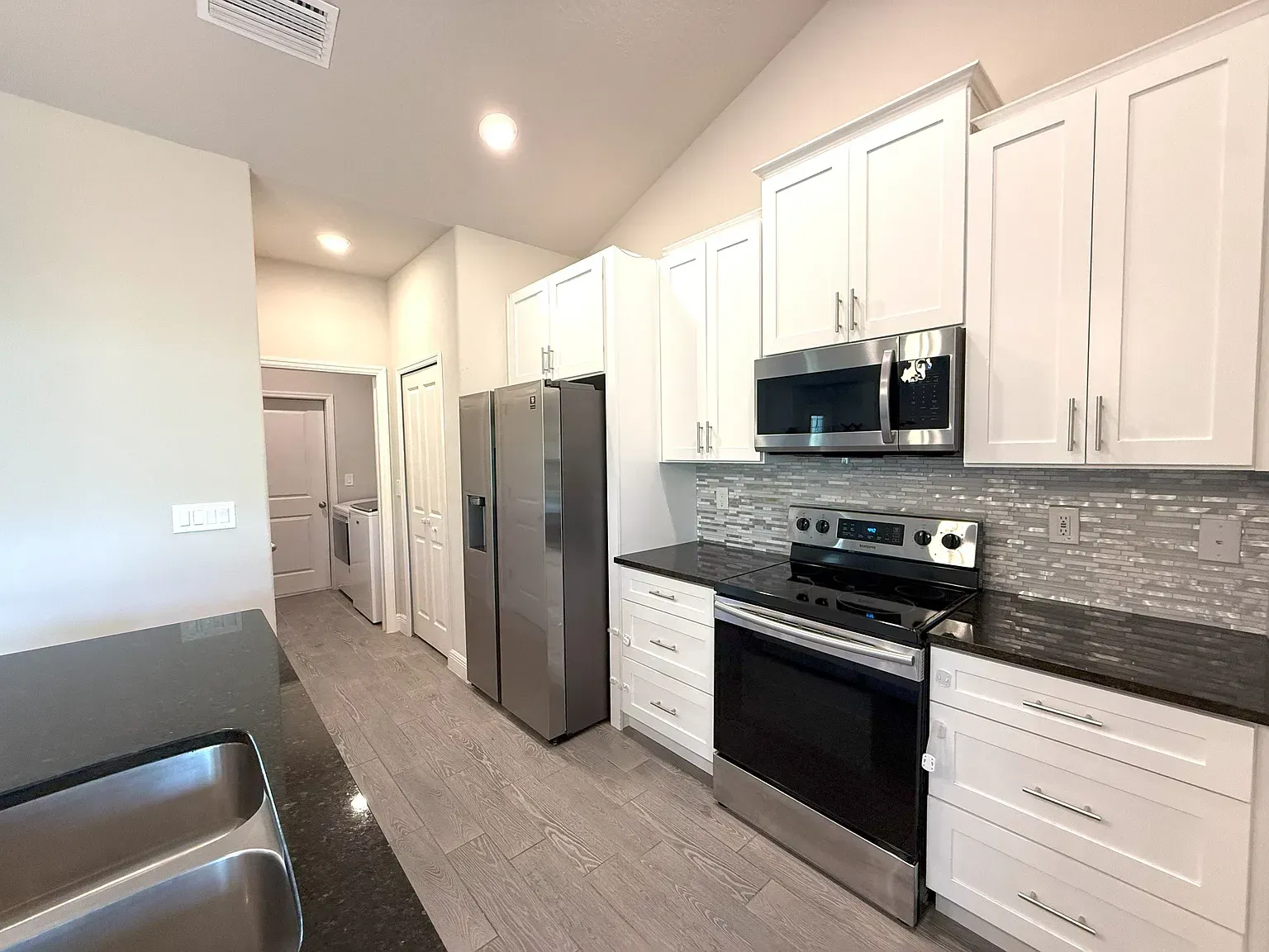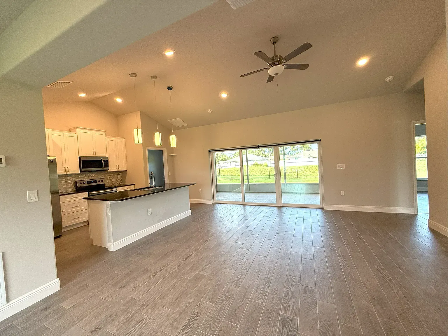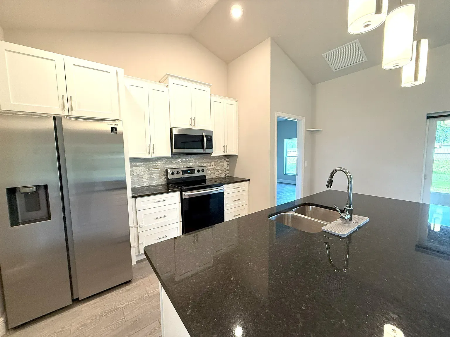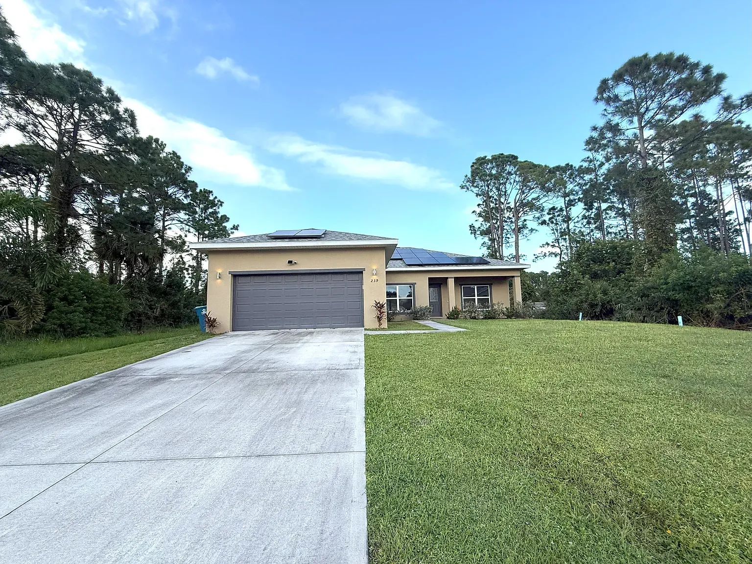 Stunning Nearly New 3BR/2BA, 2 Car Garage with city water. This home offers a blend of modern comfort and serene living. Step inside to discover an open split floor plan, accentuated by lots of natural light and high vaulted ceilings. Tiled floors in all main areas and Vinyl in bedrooms. No carpet. The kitchen features white cabinets, granite countertops, newer S.S. appliances, glass backsplash, and ample storage space. Oversized island with sleek lighting, breakfast bar, and pantry. The primary bedroom offers a peaceful retreat with large window & a walk-in closet. En-suite bathroom offers a glass-enclosed walk- in shower, dual vanities & granite tops. Two Secondary bedrooms are generously sized, with full guest bath featuring tiled shower/tub combos. Inside laundry room with washer and dryer. Two car garage. Enjoy outdoor living in a fenced in backyard oasis, overlooking the canal and Florida wild life. Screened trussed porch ideal for entertaining or unwinding after a long day. House is powered w/Solar Panels providing low cost electric bills. Convenient location, near schools, great shopping, restaurants and the beach. Easy access to major roadways only add to the charm of this home. Rent includes lawn care. Owner will consider Small pets. Available now.